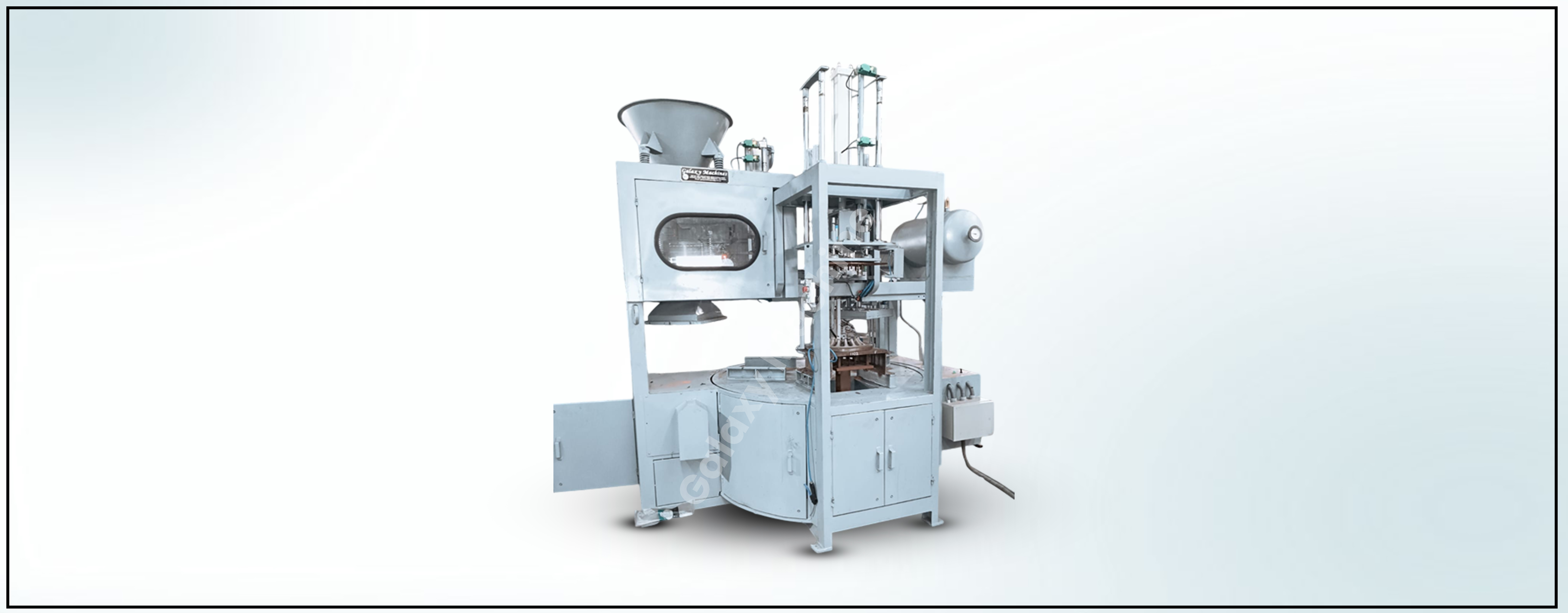 The operation of the machine is same as mentioned earlier. In this machine, the bottom halves are fixed on the rotating table. The top half are movable and are placed on the bottom halves. The top half is lifted with cylinder operated lifter mechanism core collection station.